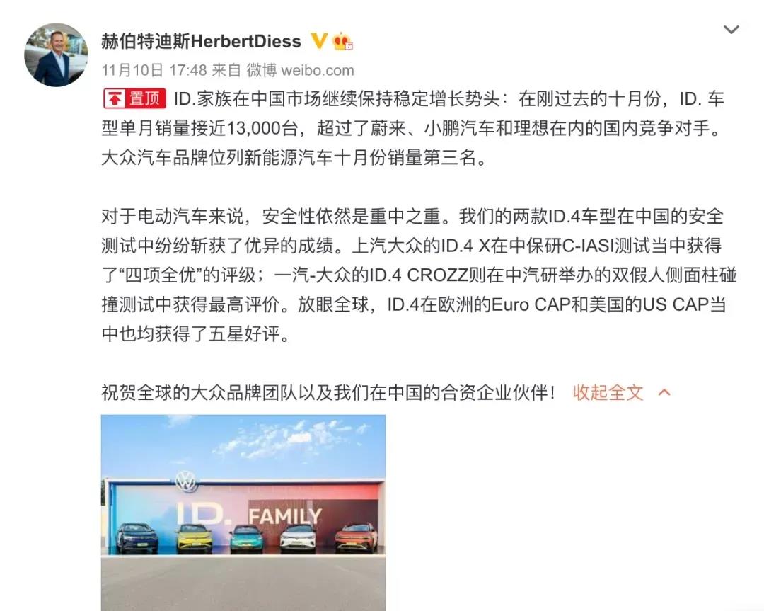 據(jù)了解,大眾旗下的德國工廠有茨維考工廠和德累斯頓工廠。而茨維考工廠主要負責生產(chǎn)大眾ID.3、ID.4、奧迪Q4 e-tron和Cupra Born等車型。值得注意的是,早幾日,大眾汽車集團迪斯在社交平臺發(fā)文表示,ID.家族在中國市場繼續(xù)保持穩(wěn)定增長勢頭,十月ID.車型單月銷量為12376臺,超過蔚來、小鵬汽車和理想等國內(nèi)競爭對手。不能看出此次停產(chǎn),也將導致這些車輛供應在短時間內(nèi)受到限制。