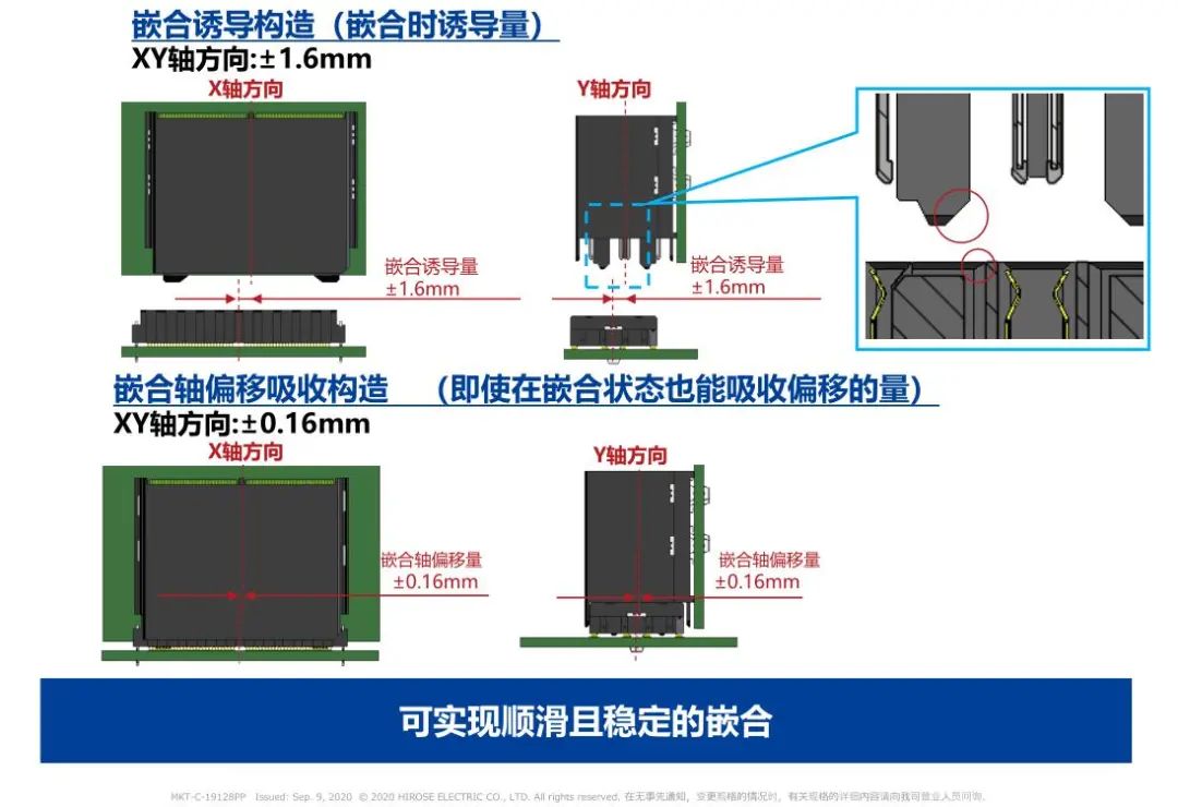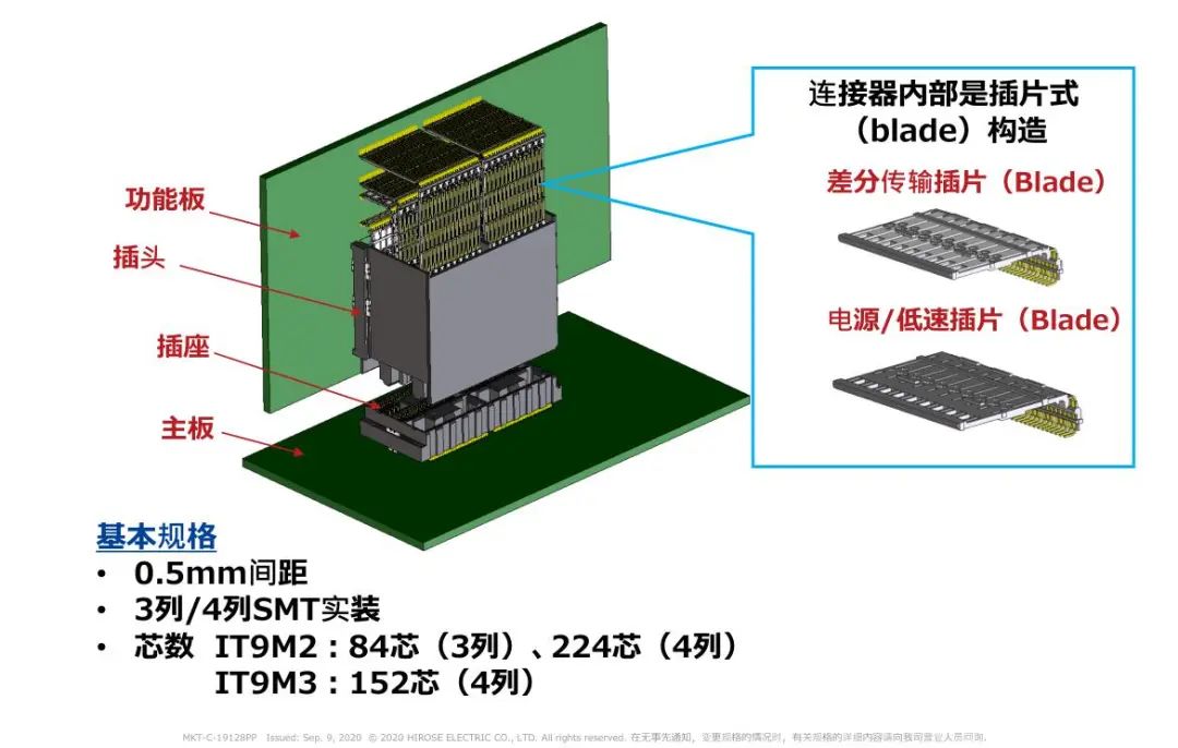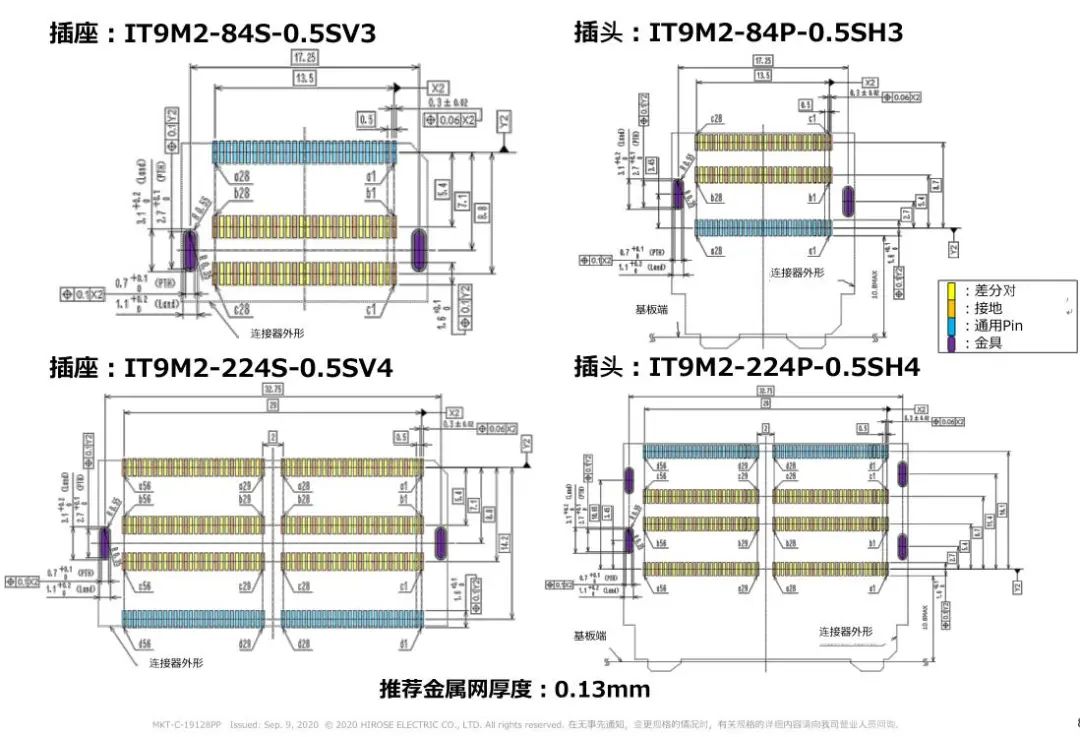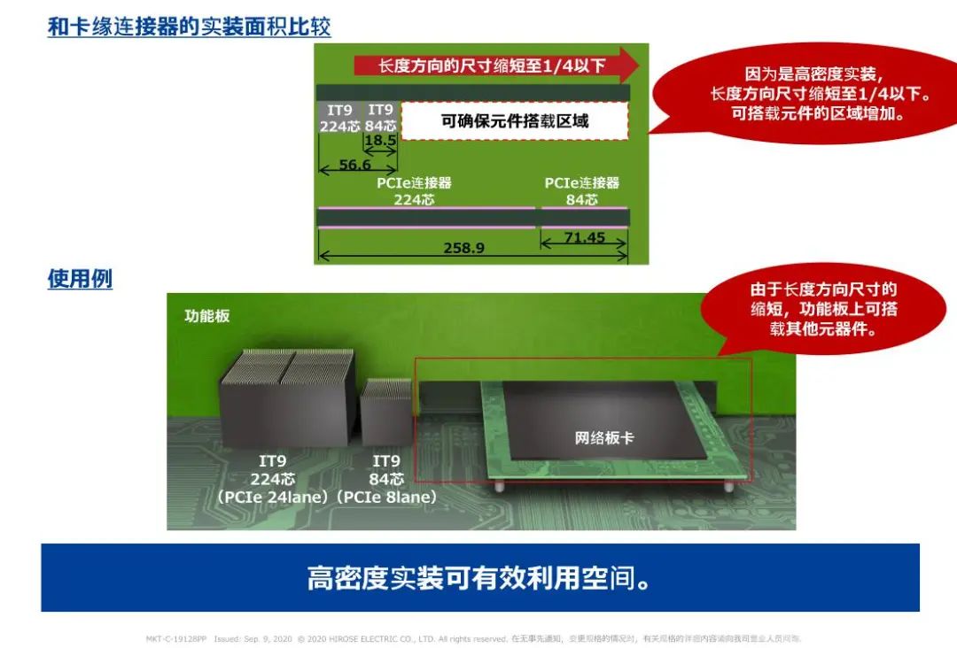 1 支持高速傳輸(28 + Gbps) 2 高密度: 50差分對/inch(224芯) 3 浮動構造: 可以在同一基板上實裝多個連接器 4 選型 芯數(shù):84芯、152芯、224芯 對應PCI Express 4.0/5.0